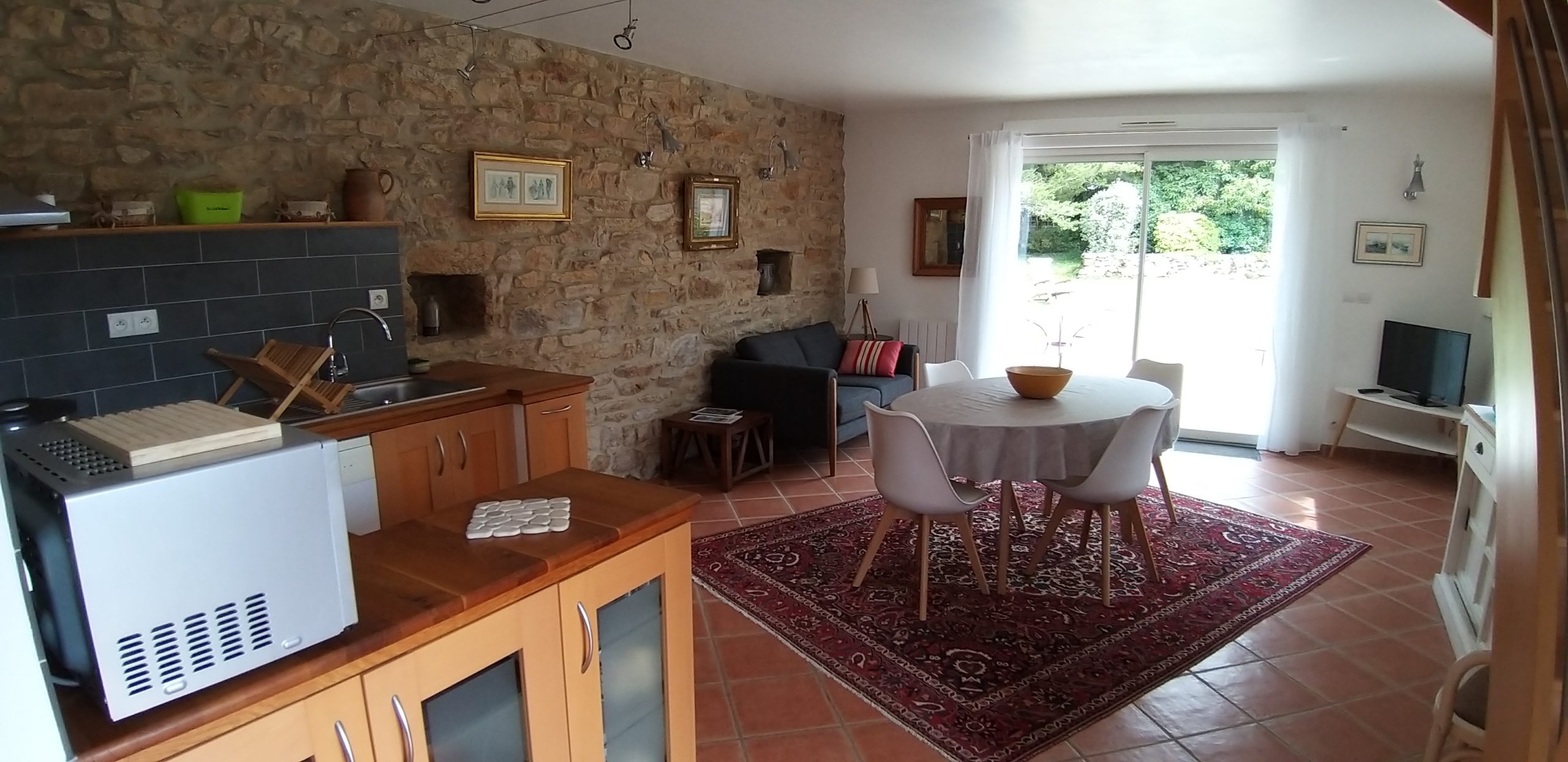 Ce gîte de 4 personnes vous offrira un vaste séjour dans un nid de pierres apparentes et une belle cuisine colorée.